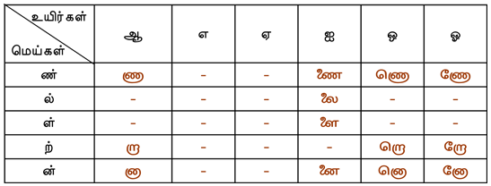 கெ, கே, கை, கொ, கோ. ஆனால் ‘ண், ல், ள், ற், ன்’ ஆகிய ஐந்து மெய் எழுத்துகள் மேலே குறிப்பிட்ட ஆறு உயிர்களோடு சேர்ந்து உயிர்மெய்களாக வரும்போது அவற்றின் வரிவடிவங்கள் 30இல் 17 வரிவடிவங்கள் மேலே கூறப்பட்டுள்ளவாறு ஓர் ஒழுங்கான அமைப்பில் காணப்பட்டன. ஆனால் ஏனைய 13 வரிவடிவங்கள் ஒழுங்கான அமைப்பில் இல்லை; வேறுபட்ட அமைப்புடன் இருந்தன. அவற்றைக் கீழ்க்கண்ட பட்டியல் காட்டும். இப்பதின்மூன்று எழுத்து வடிவங்களையும்,