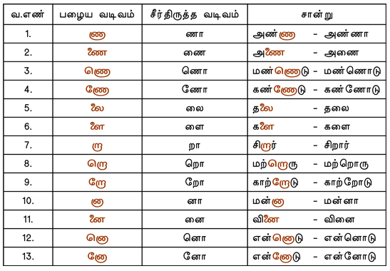 சீர்திருத்தத்தைப் பின்வரும் பட்டியல் தெளிவாகக் காட்டும். தந்தை பெரியார் மேலே குறிப்பிட்ட எழுத்துச் சீர்திருத்தத்தினைக் கி.பி. 1935இல் தமது திராவிடர் கழக நாளிதழான விடுதலையில் அறிமுகப்படுத்திப் பின்பற்றி வந்தார். மேலும் அவர் இந்த எழுத்துச் சீர்திருத்தத்தை எல்லோரும் பின்பற்ற வேண்டும் என்று வலியுறுத்தியும் வந்தார். தந்தை பெரியார் பின்பற்றிய - வலியுறுத்திய இந்த மாபெரும் எழுத்துச் சீர்திருத்தத்தை, கி.பி. 1978இல் அப்போது இருந்த தமிழ்நாடு அரசு சட்டமாக்கி, ஆணை பிறப்பித்து நடைமுறைக்குக் கொண்டு வந்தது. ‘ஆ, எ, ஏ, ஐ, ஒ, ஓ’ மற்றும் ‘அ, ஒள’ ஆகிய எட்டு உயிர்களோடு பதினெட்டு மெய் எழுத்துகளும் சேர்ந்து வரும் 144 உயிர்மெய்கள் தமிழ் நெடுங்கணக்கில் தற்போது ஓர் ஒழுங்கான வரிவடிவ அமைப்பைப் பெற, ஏனைய ‘இ, ஈ, உ, ஊ’ ஆகிய நான்கு உயிர்களுடன் பதினெட்டு மெய் எழுத்துகளும் சேர்ந்து வரும் 72 உயிர்மெய்கள் ஒரு சீரான ஒழுங்கான வரிவடிவ அமைப்பில் அமையாமல், தனித்தனியே வேறுபட்ட வரிவடிவங்களாக அமைந்துள்ளன. சான்றாக, ‘க், ச், த், ந், ம்’ என்னும் மெய் எழுத்துகள் இந்த நான்கு உயிர்களோடு சேர்ந்து வரும்போது, கி,