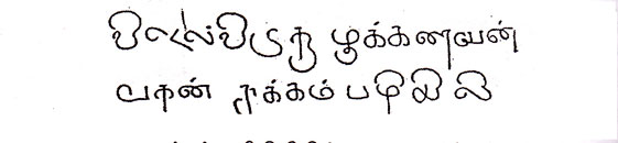 சாத்தம் பழியிலியின் சாசன எழுத்து. “விடேல் விடுகு முத்தரையன் மகன் சாத்தம் பழியிலி” என்பது இதன் வாசகம். சோழ அரசர் அக்காலத்தில் சோழநாடு பல்லவ அரசுக்குக் கீழ்ப்பட்டிருந்தது. சோழ அரச குடும்பத்தார் உறையூர், திருவாரூர், பழையாறை முதலிய இடங்களில் பல்லவ அரசருக்குக் கீழடங்கிச் சிற்றரசர்களாக இருந்தார்கள். தெள்ளாறெறிந்த நந்திவர்மன் காலத்தில் இருந்த சோழ அரசன் குமாராங்குசன் என்பவன். இவனைப்பற்றி நந்திவர்மனுடைய வேலூர்பாளைய சாசனம் இவ்வாறு கூறுகிறது. “தன்னுடைய வீரத்தினாலே விளங்கப்பட்டவனும் தன்னுடைய ஈகையினாலே கர்ணனுக்குச் சமானமானவனும் நல்ல ஒழுக்கமுடை யவனும் வீரமிக்க சோழ குலத்துக்குச் சூளாமணி போன்றவனுமான் குமாரராங்குசன்” என்றும், “சோழ மகாராசன்” என்றும் கூறுகிறது. |
