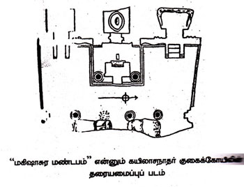 மகிஷாசுரமண்டபம் மகிஷாசுரமண்டபம் என்றுபெயர் கூறப்படுகிற இக்கோயிலை மாமல்லபுரத்துக் கிராமத்தார் கயிலாசநாதர் கோயில் என்று கூறுகிறார்கள். மாமல்லபுரத்துக் கலங்கரை விளக்குக்கு அருகில் இருக்கிற இக் குகைக்கோயில் வெகு அழகாகவும் கம்பீரமாகவும் காட்சியளிக்கிறது. இதன் சில பகுதிகள் முற்றுப்பெற அமைக்கப் படாமல் அரைகுறையாக விடப்பட்டுள்ளன. முற்றுப்பெற்ற பகுதிகள் வெகு அழகாகக் கண்ணுக்கினிய காட்சியாக இருக்கின்றன. தரைமட்டத்துக்கு நான்குஅடி உயரத்துக்குமேலே அமைக்கப் பட்டுள்ள இக்குகைக்கோயில், முகமண்டபத்தையும் அதற்குப் பின்னால் மூன்று கருவறைகளையும் கொண்டிருக்கிறது. முகமண்டபம் 32 அடி நீளமும் 15 அடி அகலமும் 121/2 அடி உயரமும் உள்ளது. மண்டபத்தைத் தாங்கும் தூண்கள் உருண்டு திரண்டு பதினாறு பட்டையுடையனவாக உள்ளன. இத் தூண்களில் ஒன்றை எடுத்துக்கொண்டுபோய், இதற்குப் பின்புறத்தில் இருக்கிற வராகப்பெருமாள் குகைக்கோயிலில் பிற்காலத்தவர் யாரோ வைத்திருக்கிறார்கள். மற்றொரு தூணையும் பெயர்த்துக் கொண்டு போக முயற்சி செய்ததை அத்தூணின் உச்சியில் உளியினால்