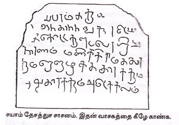 சயாம் தேசத்துச் சாசனம் சயாம் தேசத்து தகோபா மாவட்டத்தில் காவு பஃரஹ் நாராய் (நாராயண குன்று) என்னும் இடத்தில் ஒரு தமிழ் எழுத்துச் சாசனம் கண்டுபிடிக்கப்பட்டது. அச்சாசனத்தில் சில எழுத்துக்கள் மறைந்து விட்டன. அது அவனி நாரணன் (தெள்ளாறெறிந்த நந்திவர்மன்) காலத்துச் சாசனம் என்று சரித்திர ஆராய்ச்சிக்காரர்கள் கருதுகிறார்கள். அந்தச் சாசனத்தின் வாசகம் இது :