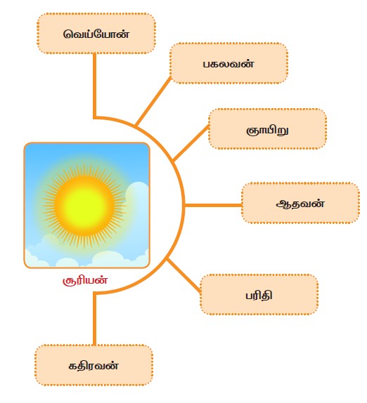 கட்டத்திலுள்ள சொற்கள் ‘சூரியன்’ என்னும் ஒரு பொருளையே குறிக்கின்றன.