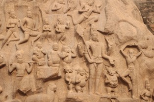 புடைப்புச் சிற்பங்களைத் தொட்டுப் பார்த்த லிஸி இங்கு ஒருவர் ஒற்றைக்காலில் நிற்கிறார். அருகில் அருவியிலிருந்து நீர் கொட்டுகிறது. நீரில் பறவைகள் நீந்துகின்றன. அங்கு மான், புலி, சிங்கம், குரங்கு ஆகியவற்றின் சிற்பங்கள் உள்ளன என்றாள்.