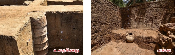 | அறிவுச்செல்வன் | : | நீங்கள் காண்பது, உறைகிணறு! இது, சுடுமண் உறைகளால் (வளையங்களால்) ஆனது. பொதுவாக, மணற்பாங்கான பகுதிகளில் மணல் கிணற்றினுள் சரியாமல் இருக்க, இதுபோன்ற கிணறு கட்டப்படுவதுண்டு. அதனை ஒட்டி காண்பது சுட்ட செங்கற்களால் கட்டப்பட்ட சுவர். |