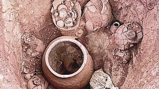 இங்கே கிடைத்த ஒரு பானையின் உட்புறத்தில் நடனமாடும் பெண்ணின் உருவம் வரையப்பட்டுள்ளது. அதன் பக்கத்தில் கரும்பு போன்ற தாவரம், கொக்கு, முதலை போன்றவை வரையப்பட்டுள்ளன. வரலாற்றுக்கு முந்தைய காலத்தைச் சேர்ந்த கலை வடிவங்கள் வெகு அரிதாகவே கிடைத்துள்ள நிலையில், மட்பாண்டங்களைச் சுடுவதற்கு முன்பாகவே மிக நுண்ணிய தூரிகையால் அவற்றில் வரையப்பட்டுள்ள சில வடிவங்கள் நமக்குப் பல அரிய தரவுகளை அளிக்கின்றன. |