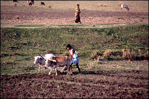 காவேரிக்கரைக் கழனியில் உழவு வேலை செய்யும் தொழிலாளி,