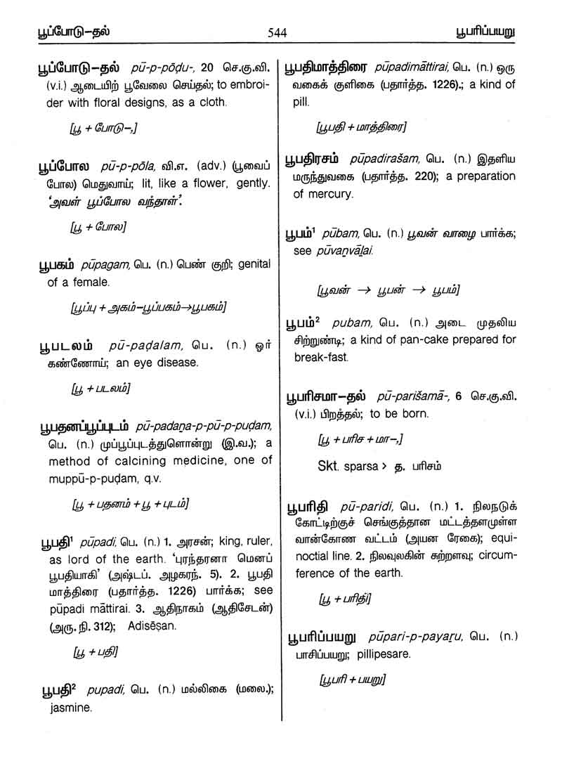 பகுதி (பக்கம் எண்) முன்னுரை (1 - 12) பி (1 - 196) பீ (197 - 217) பு (218 - 478) பூ (478 - 577)