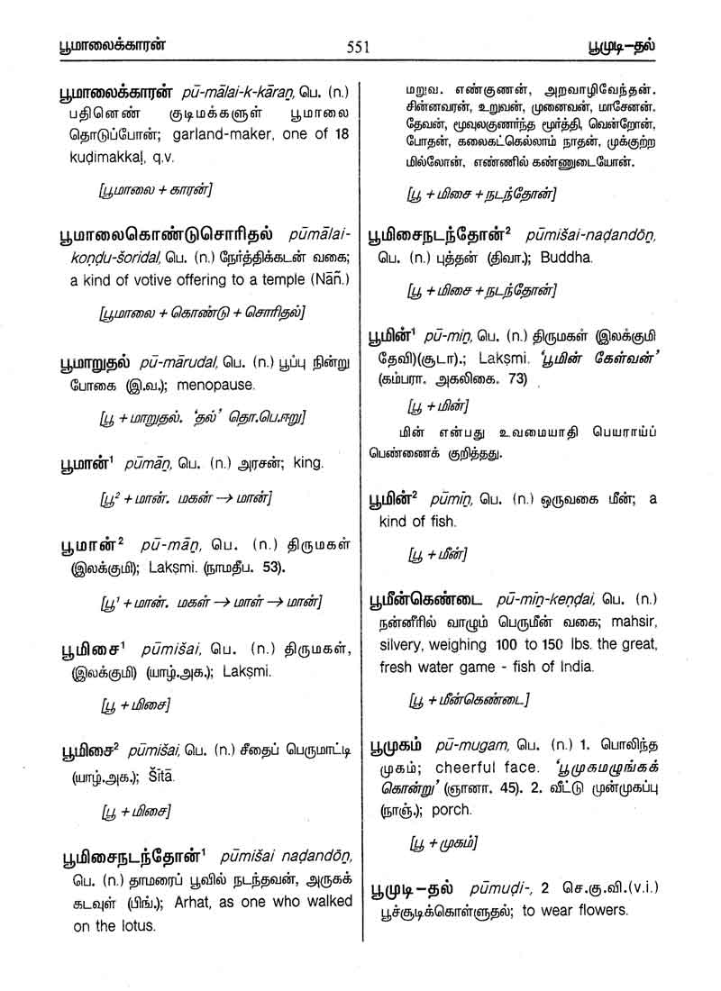 பகுதி (பக்கம் எண்) முன்னுரை (1 - 12) பி (1 - 196) பீ (197 - 217) பு (218 - 478) பூ (478 - 577)