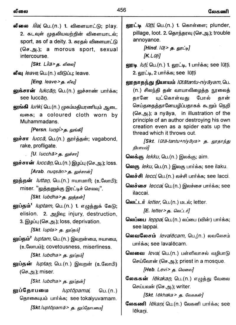 பகுதி (பக்கம் எண்) முன்னுரை (1 - 25) த - தௌ (1 - 108) ந - நௌ (109 - 202) ப - பௌ (203 - 357) ம - மௌ (358 - 408) ய - யௌ (409 - 431) ர - ரௌ (431 - 445) ல - லௌ (446 - 462) வ - வௌ (463 - 499) பின்னிணைப்பு (500 - 553)